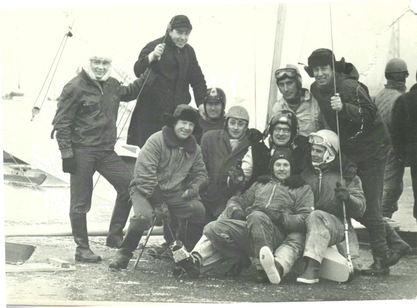 Внизу памятный снимок на чемпионате СССР в Стрельне. Буер А.Коновалова был красивого желтого цвета, я присутствовал, но не в кадре, так как кроме Бологова, все остальные на снимке - участники теплых застолий в парусной мастерской А. Коновалова. (не хватает только Доктора) Малява с Коноваловым присели на нос Монотипа, так что корма приподнялась. Справа от мачты стоит совсем трезвый Жадовский в шлеме, Под ним сидят: Малява в очках, еще ниже в танковом шлеме Николай Васильевич Красноперов, справа от него в светлом шлеме Анатолий Коновалов. Крайний слева в белой ушанке Шура Бологов. Справа в шлеме спиной стоит Каргаполов