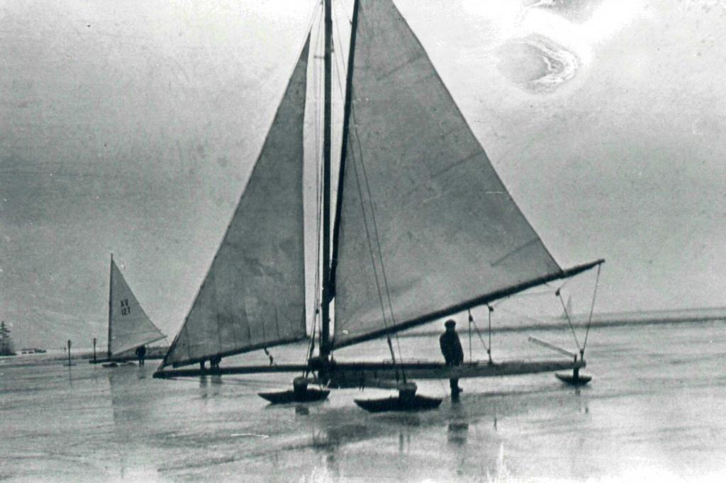 Вид с кормы гафельного буера с корпусом типа "лодка". Фото времен Блокады Ленинграда