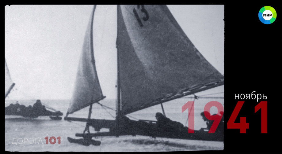Лейтенант С.С. Гаскевич в буерном патруле на льду Ф.З. Предположительно на заднем плане - Елагин остров напротив "Водника". Буера применялись для охраны водного района Невской губы, и на Ладожском озере на "Дороге Жизни"